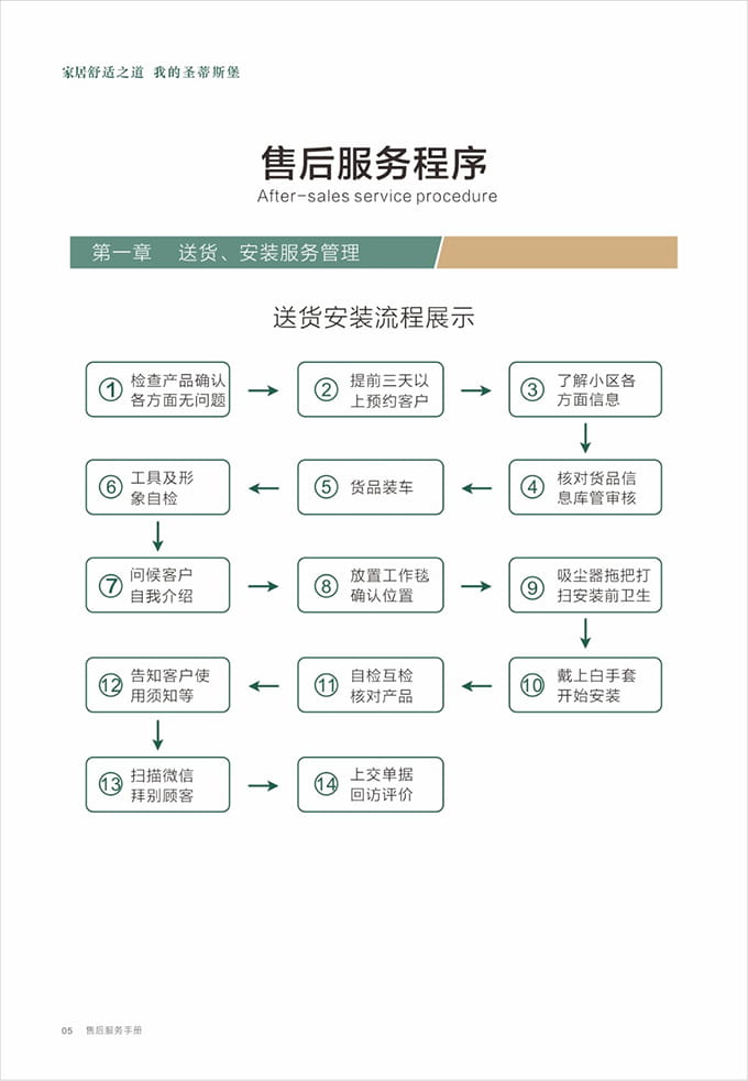 物資準備:上門前必須著圣蒂斯堡統(tǒng)一工作服,佩戴工作證,準備好安裝工具、搬抬工具(搬運背帶等)、備件、筆記本、手套、鞋套、地墊、衛(wèi)生清掃工具(清潔劑、抹布、掃把簸箕、拖把、吸塵器等)、瓶裝水、《圣蒂斯堡安裝施工指示牌》、收據(jù)和圣蒂斯堡產(chǎn)品說明書、《產(chǎn)品配送單》和《配送滿意度調(diào)查表》等物品。再帶上小禮品,例:鮮花或碳包去味禮包等。