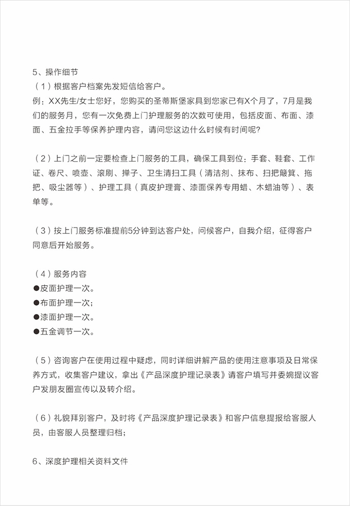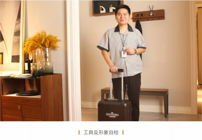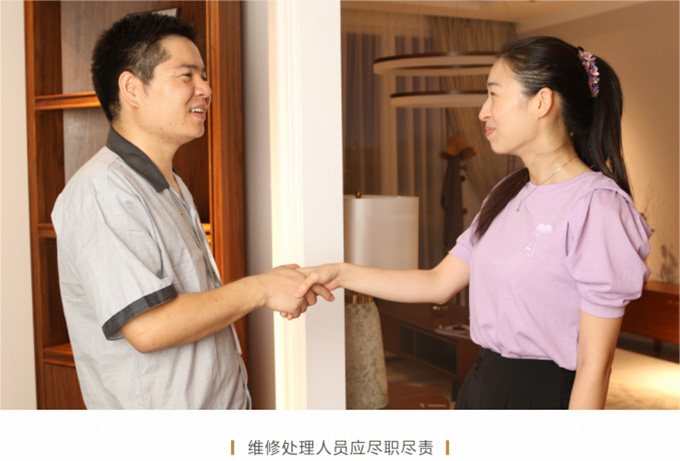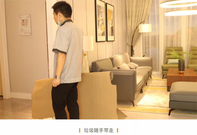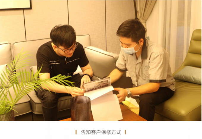 產(chǎn)品處理完畢后必須一站式通檢,指導客戶使用,并將服務過程中產(chǎn)生的垃圾隨手帶走,家具維修完畢后,應用毛巾將家具擦拭一遍,確保產(chǎn)品清潔。