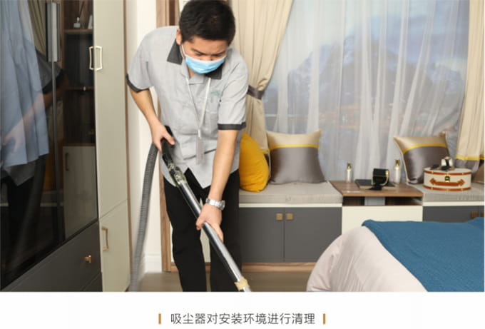 產(chǎn)品安裝確認無誤后及時清理房間內(nèi)因安裝產(chǎn)生的垃圾并保持空氣流暢,然后用干凈的抹布將家具擦拭一遍,確保產(chǎn)品清潔,用吸塵器對安裝環(huán)境進行清理,并對所有安裝好的產(chǎn)品拍攝記錄作為完工效果備案。