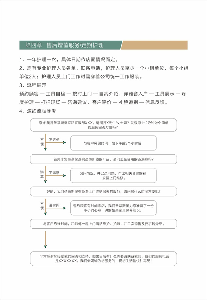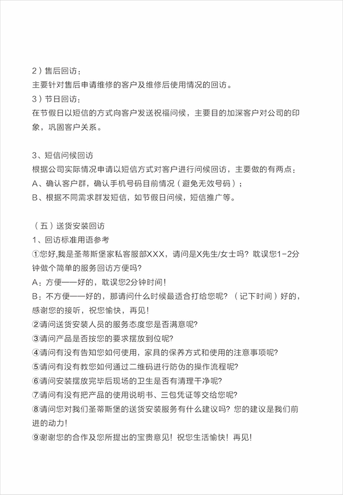 話術(shù)參考:“**先生/女士您好,我是圣蒂斯堡的售后服務人員**,您購買的圣蒂斯堡家具已經(jīng)全部到貨了,送貨安裝大約需要**時間,請問您這邊什么時候方便我們上門送貨安裝呢?”同時要了解送貨小區(qū)的電梯、樓道、入戶門的尺寸等,提前做好準備,避免意外情況。最后確定送貨時間(安裝所需要時長),并告知客戶安裝人員的相關(guān)信息,可加微信發(fā)送,并發(fā)送配送安裝流程說明。
