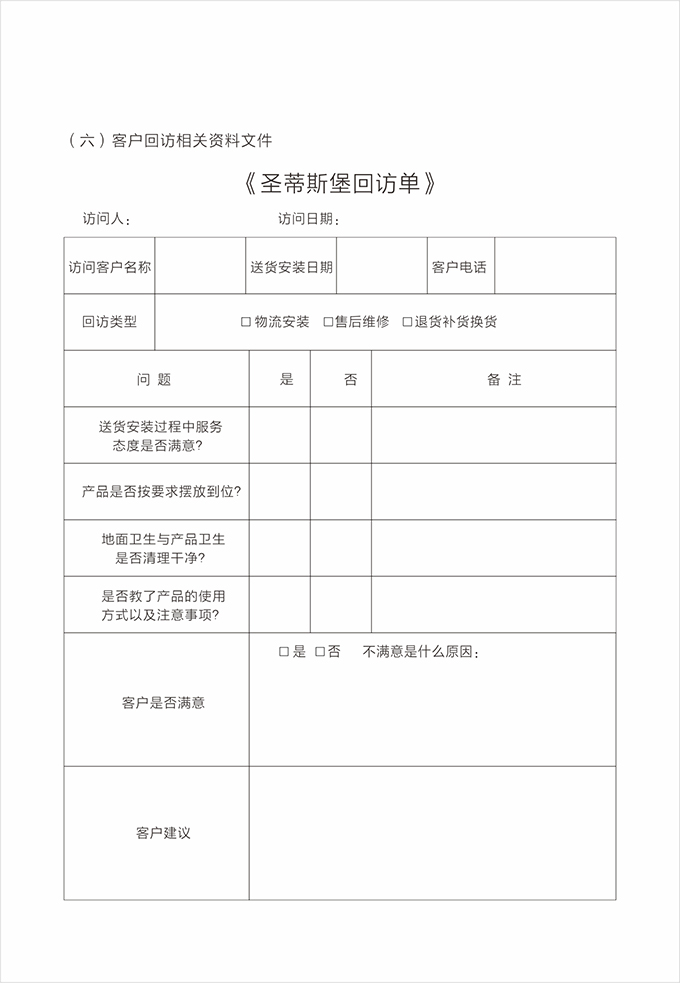 告別之前:告知客戶圣蒂斯堡全國免費服務電話(售后服務貼)以及保修方式,請客戶在《產(chǎn)品配送單》上簽名,并填寫《配送滿意度調(diào)查表》后,合影留念。