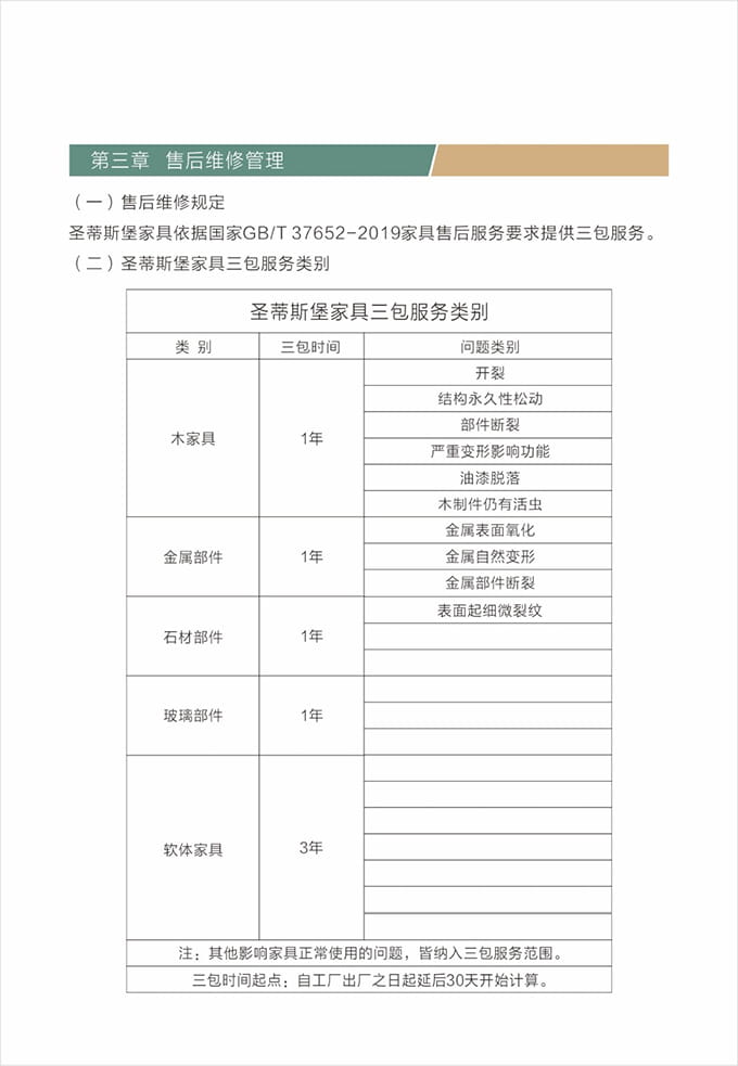 維修人員上門維修處理問題上門前必須著圣蒂斯堡統(tǒng)一工作服,佩戴上崗證并盡量攜帶維修處理過程中可能會使用到的工具和備用配件例:工具、備件、筆記本、手套、腳套、收據(jù)和《圣蒂斯堡售后服務信息單》等物品。