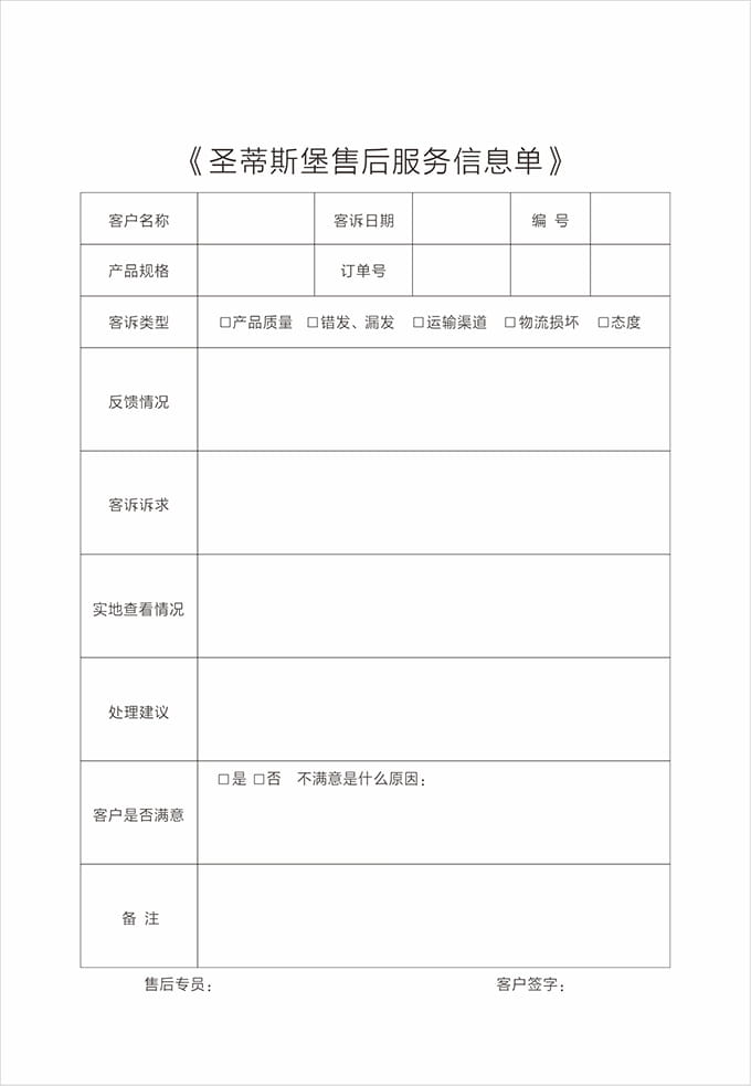 現(xiàn)場修復完成后,請客戶確認,在《圣蒂斯堡售后服務信息單》上簽字;不能現(xiàn)場修復時則必須跟客戶說明清楚,征得客戶同意后將產(chǎn)品帶回處理或返廠處理,應開具相關(guān)收據(jù)交予顧客,并且登記備案;修理完畢后按照配送流程送到顧客家后應向顧客索回收據(jù),并且請顧客在《圣蒂斯堡售后服務信息單》簽字。