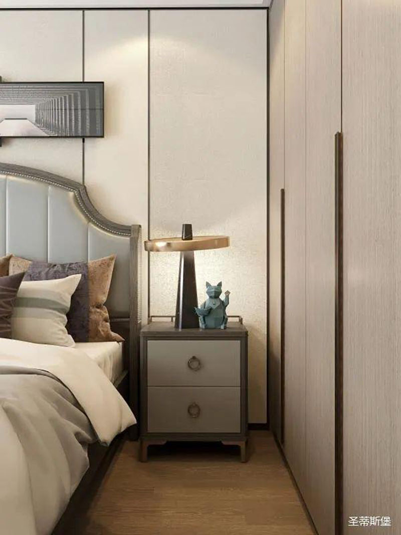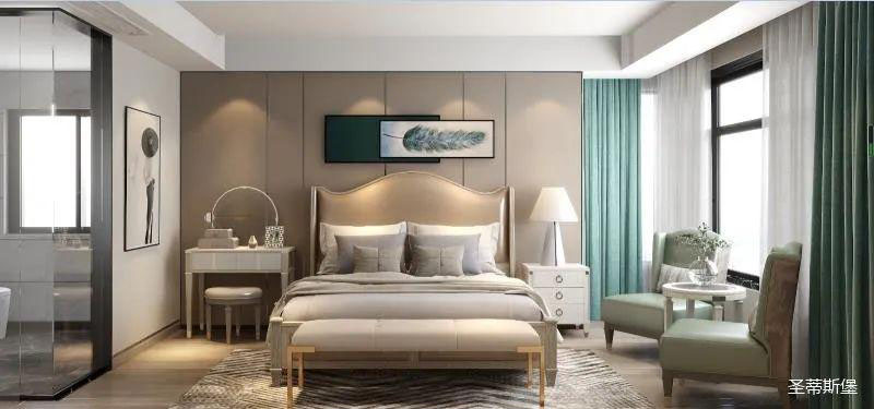 ▲次臥空間主要是以淺色為底調(diào),大面積的莫蘭迪色與淺色相平衡。極強(qiáng)線性裝飾畫帶來的延伸感讓視覺煥然一新。少許的金屬元素?cái)z入,瞬間提升了空間的精致度,將溫潤(rùn)雅致與時(shí)尚輕奢糅合在同一空間里,每一處都洋溢著浪漫的氣息。