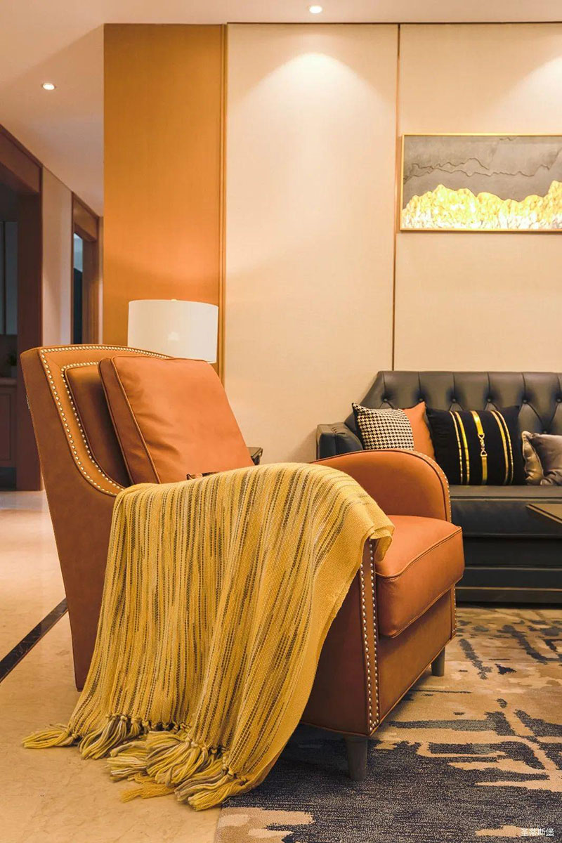 愛(ài)馬仕橙的休閑椅是空間的點(diǎn)睛之筆,相對(duì)于霸氣沉穩(wěn)的墨綠雙人沙發(fā),它更為時(shí)尚摩登,兩者合理搭配,賦予了空間陽(yáng)剛與柔情并存的意境。