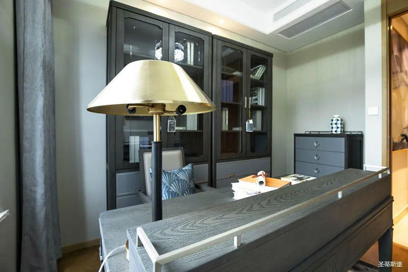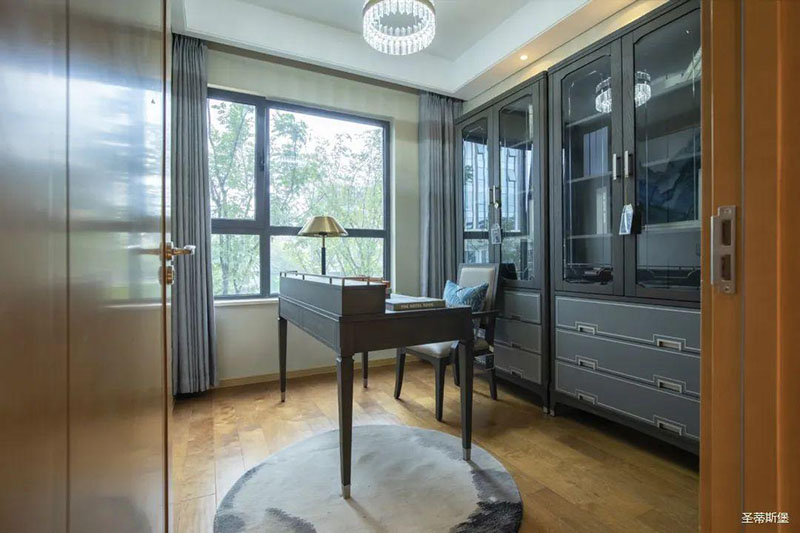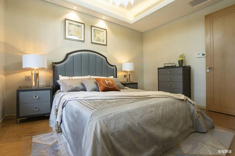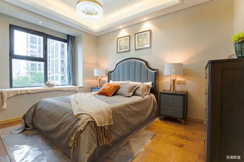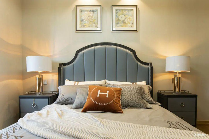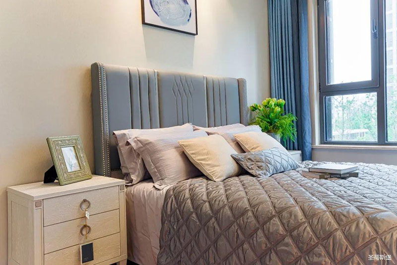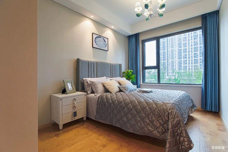 次臥高床屏由金屬鑲嵌,呈現(xiàn)簡(jiǎn)約有序的線條,霧霾藍(lán)床屏與淺藍(lán)朦朧裝飾畫(huà),窗簾相呼應(yīng),色澤搭配和諧自然,無(wú)不透漏著一種簡(jiǎn)潔大方視覺(jué)體驗(yàn)。