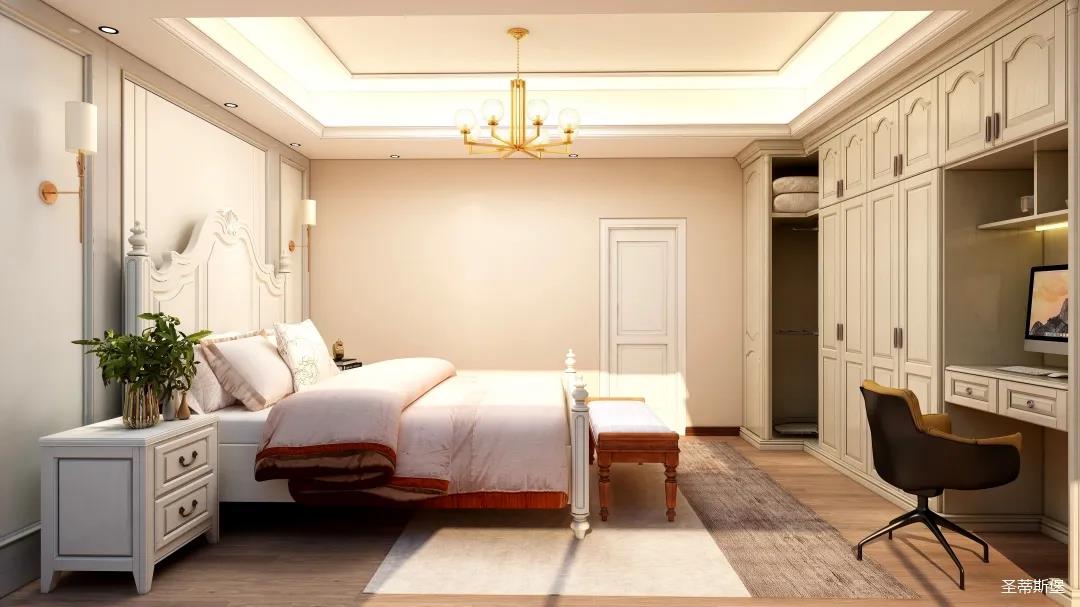 次臥的設(shè)計(jì)更注重收納,人性化嵌入式書桌,整排衣柜設(shè)計(jì)有效的利用了空間每一個角落。床屏在保持原有美式家具特色的同時,增加了線條美,將繁雜的雕琢簡化,并融入時尚的美式元素,壁燈,吊燈糅合自然光影,完美呈現(xiàn)出尊貴的空間格調(diào)。