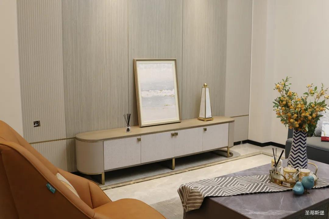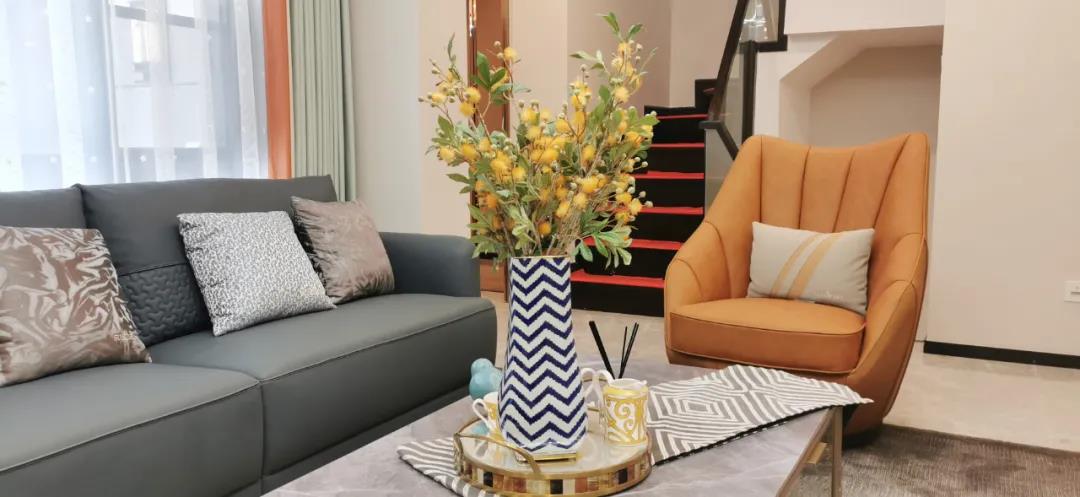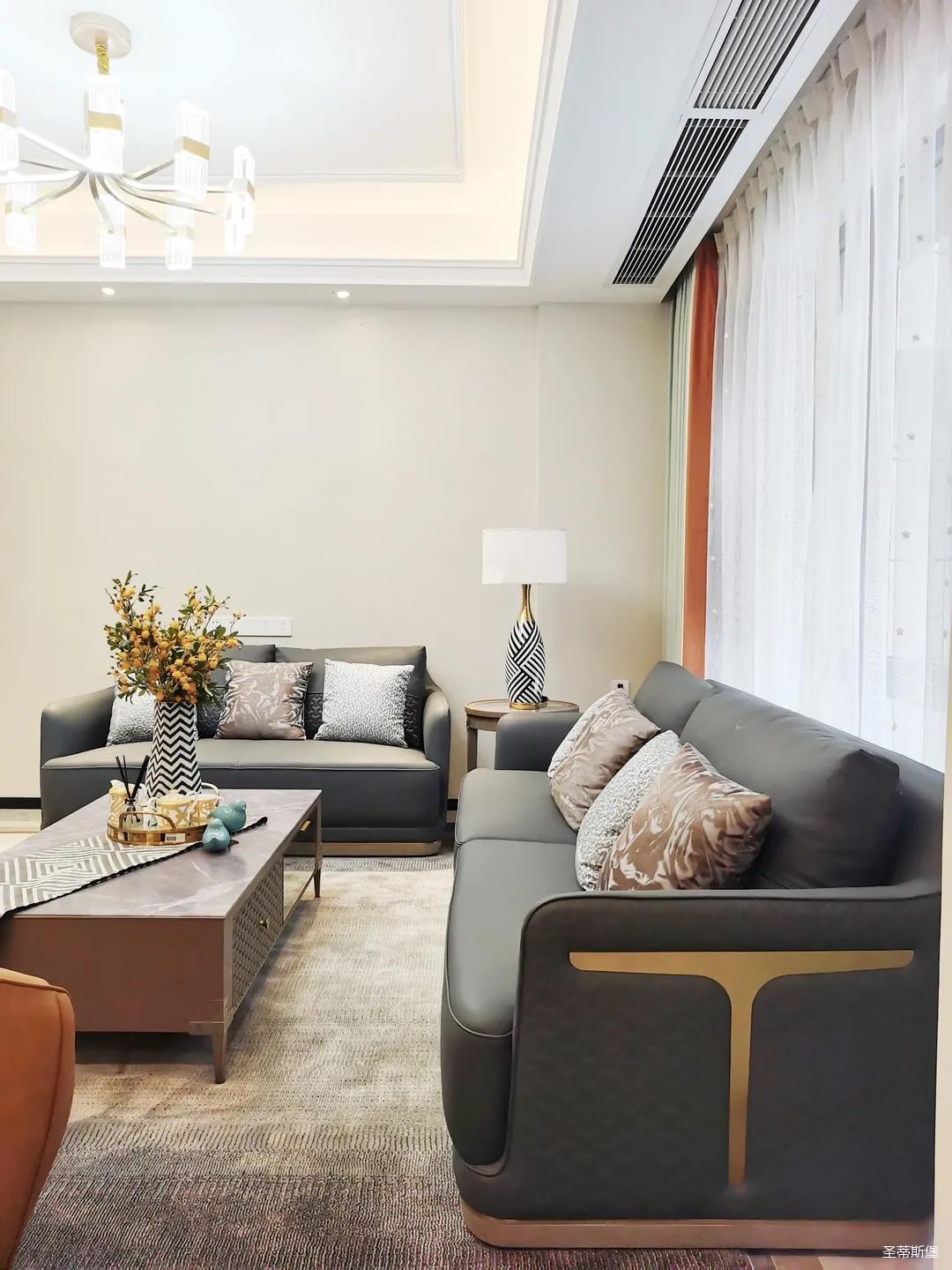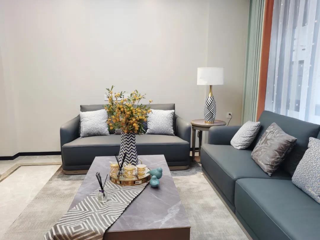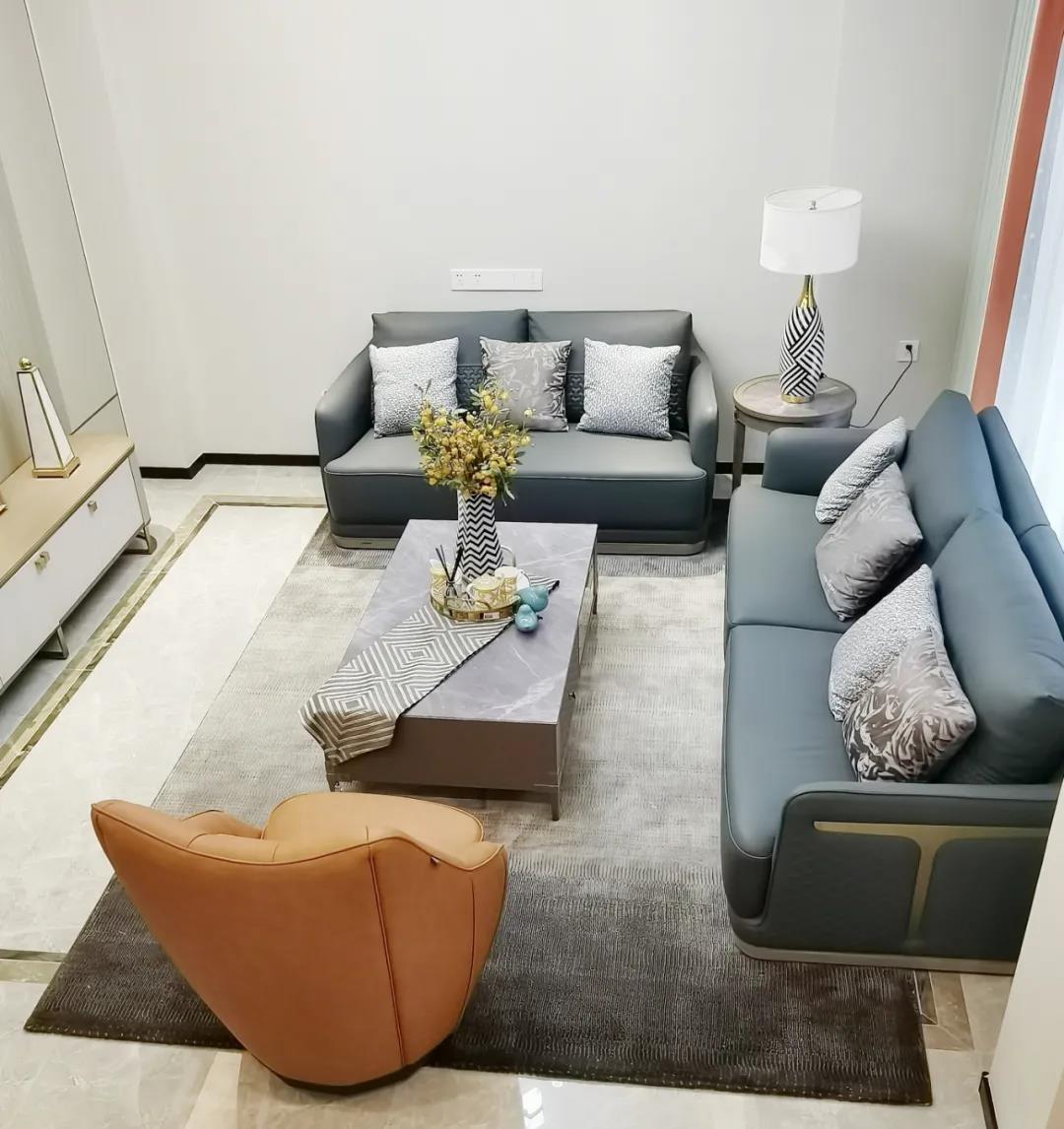 淺灰為基底的飾面與低飽和度的深色沙發(fā)相互映襯,產(chǎn)生強烈的視覺沖擊,深色的家具讓空間從視覺上衍生出一種縱深感。巖玻的質(zhì)感與真皮編織的紋理盡顯現(xiàn)代之美,細節(jié)陶瓷擺件注滿了空間優(yōu)雅的藝術(shù)氛圍。