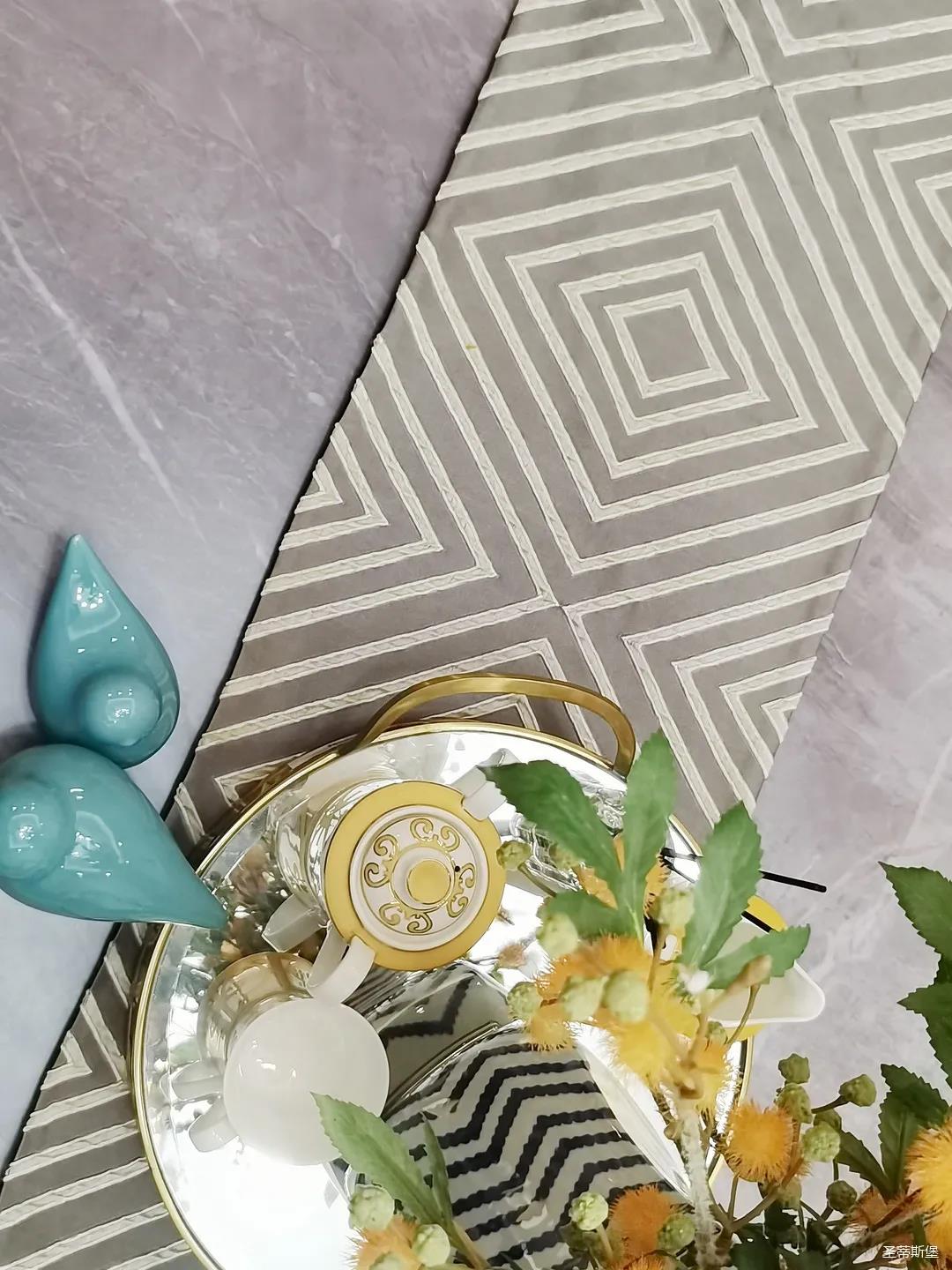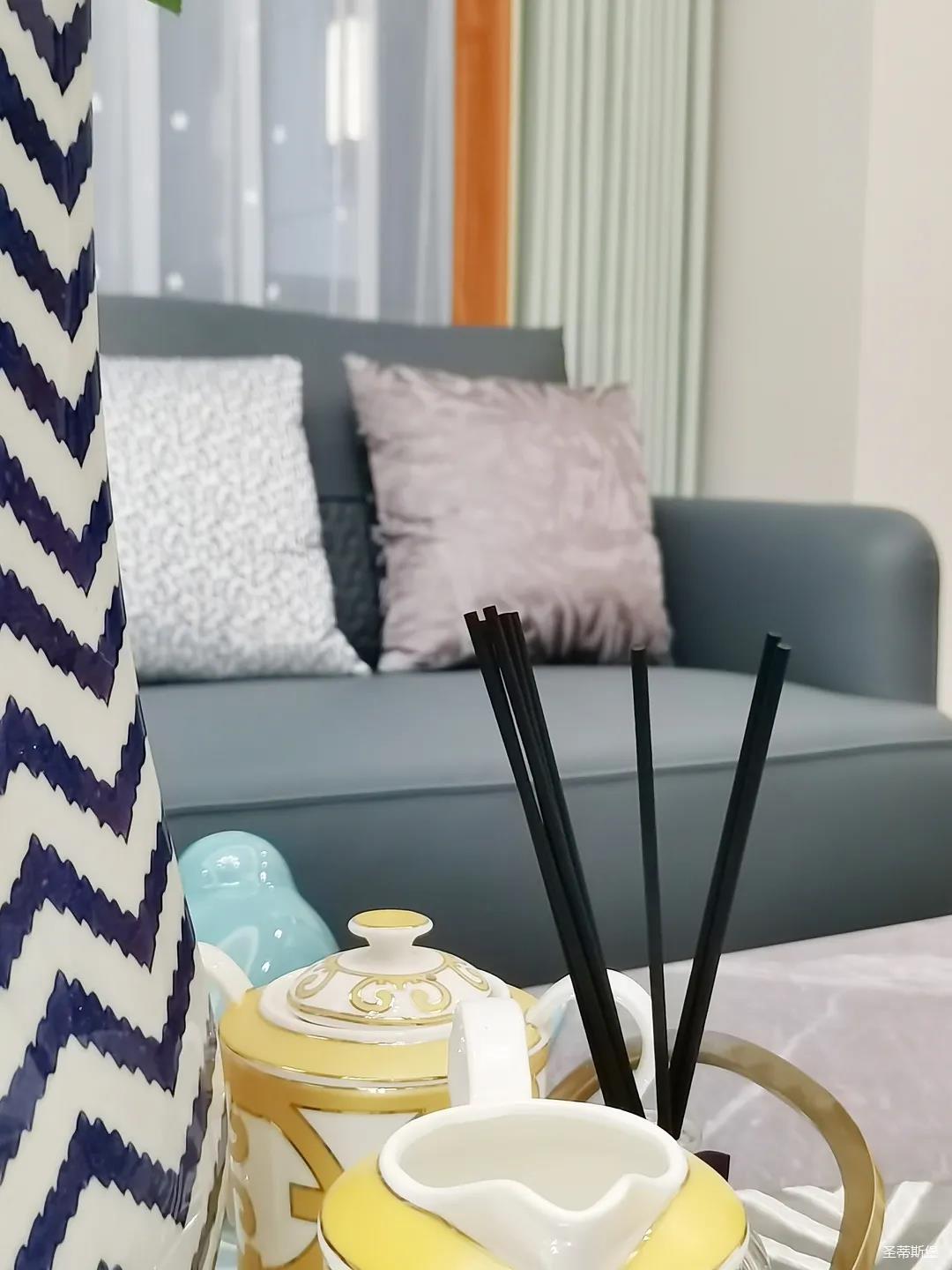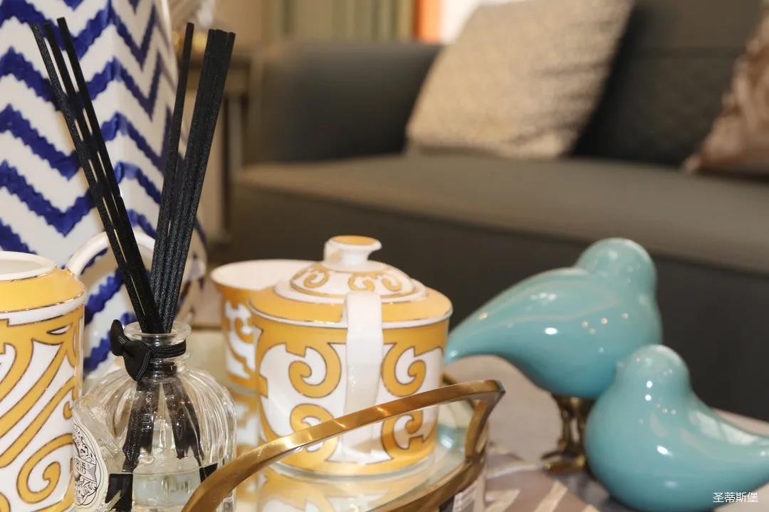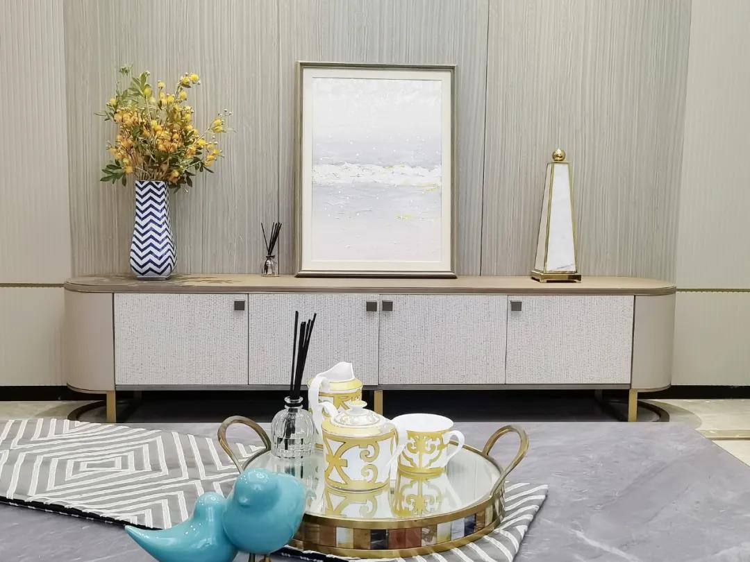 淺灰為基底的飾面與低飽和度的深色沙發(fā)相互映襯,產(chǎn)生強烈的視覺沖擊,深色的家具讓空間從視覺上衍生出一種縱深感。巖玻的質(zhì)感與真皮編織的紋理盡顯現(xiàn)代之美,細節(jié)陶瓷擺件注滿了空間優(yōu)雅的藝術(shù)氛圍。