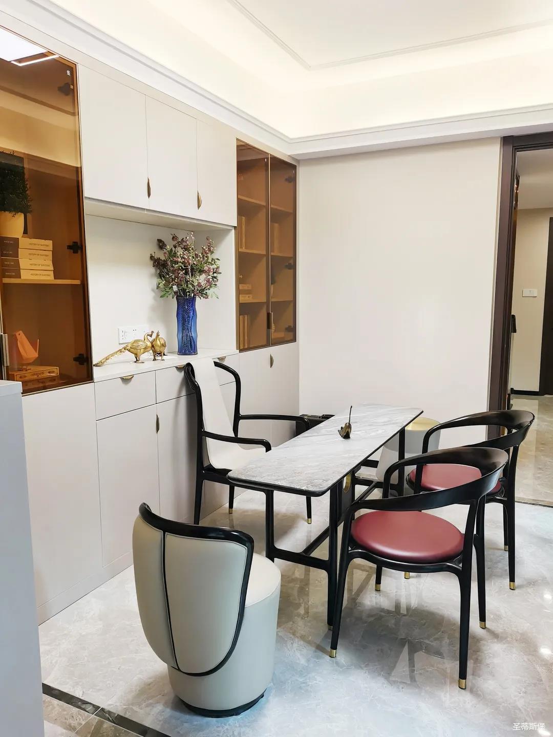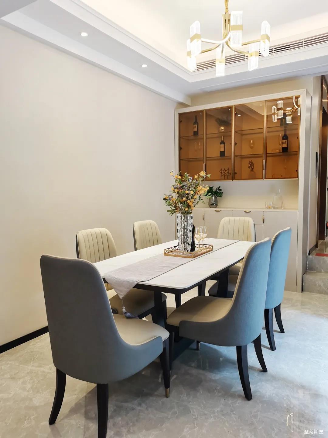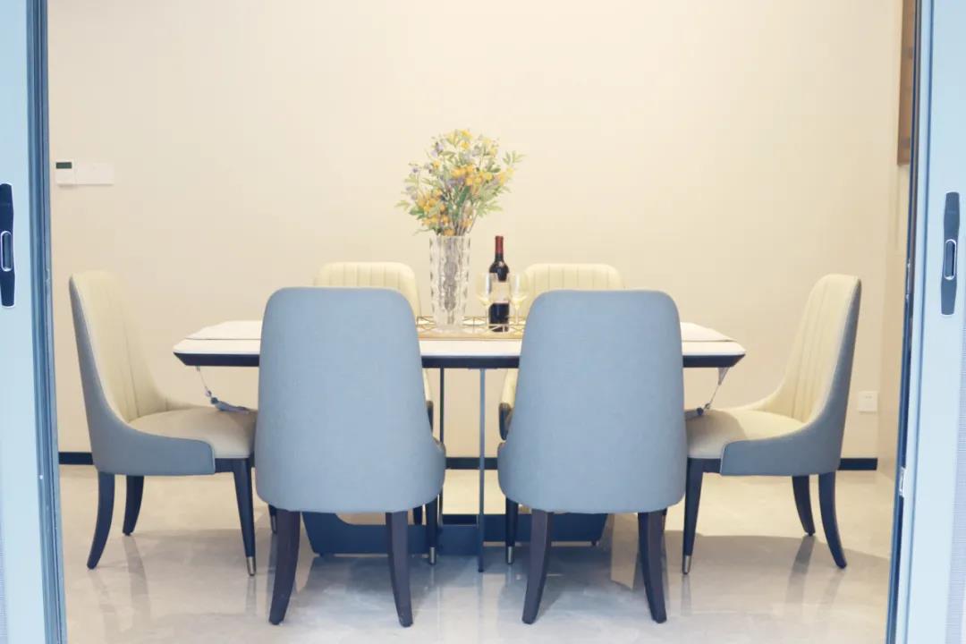 客餐廳雖屬同層,但由廊道隔開,各有寬闊的空間格局,加上引入自然光源的采光設(shè)計,空間通透明亮。巖板餐桌搭配的真皮餐椅,讓不同的材質(zhì)在在空間完美契合,既增加了空間的時尚氛圍,也能給人良好的用餐體驗。