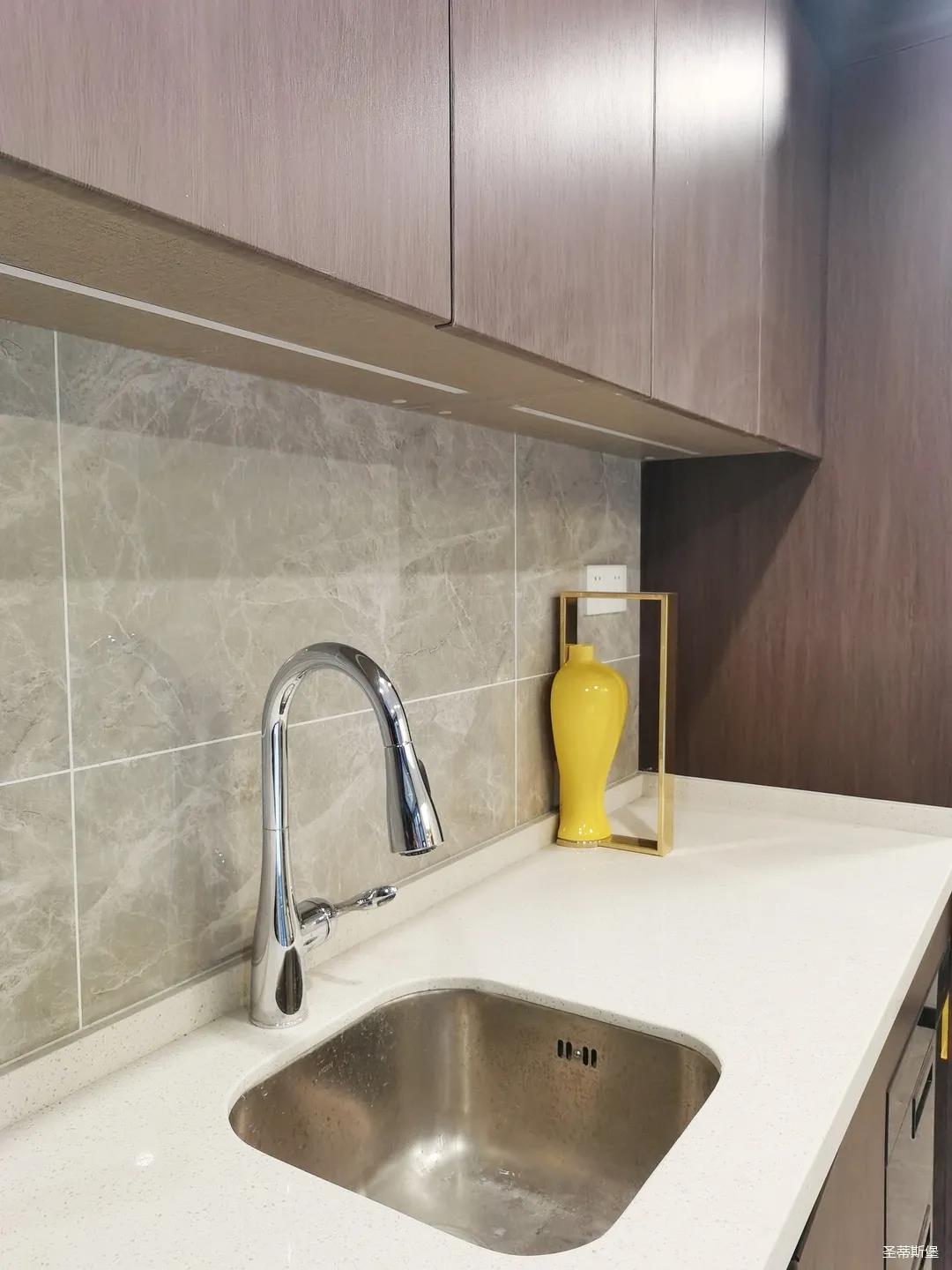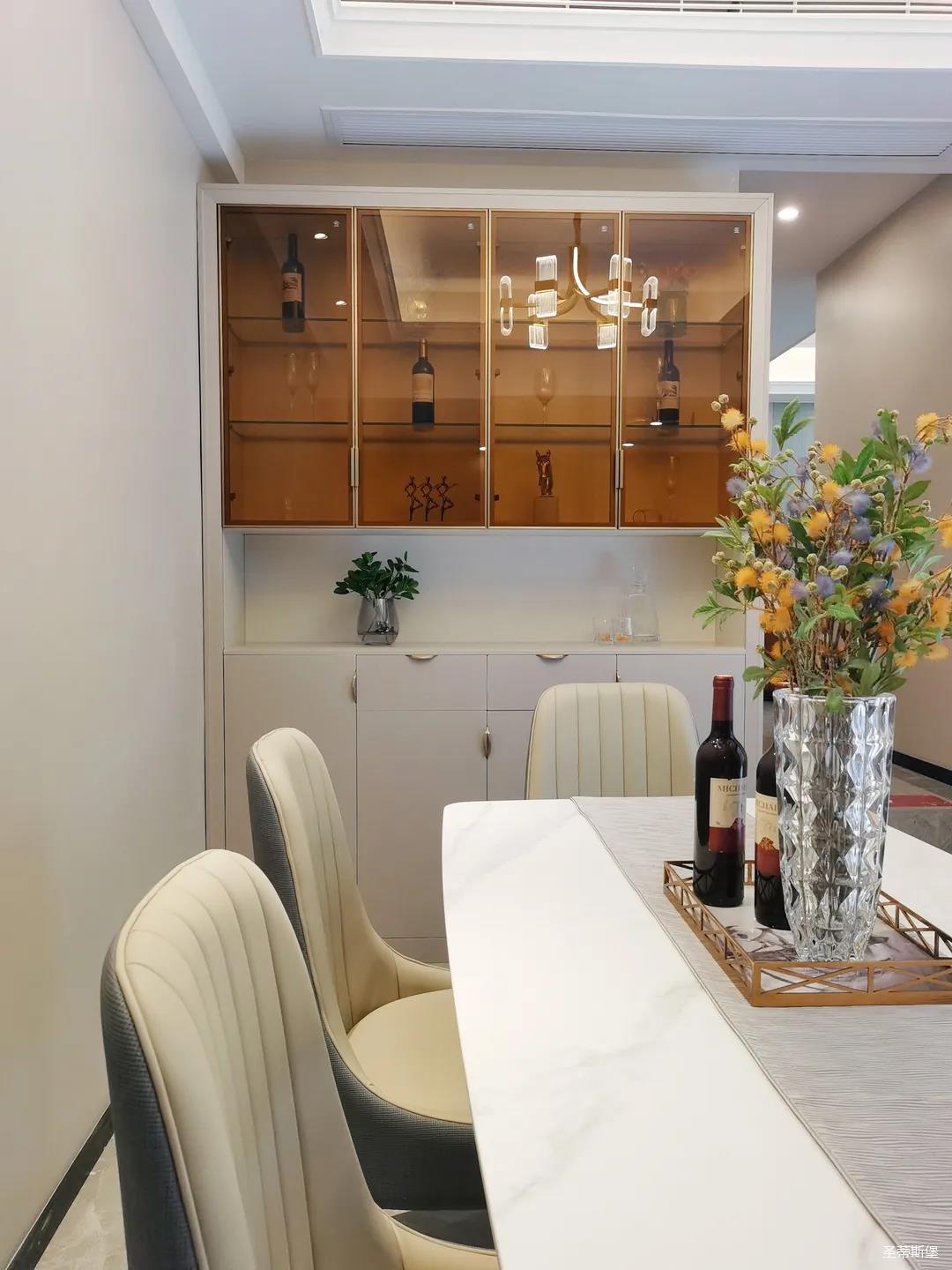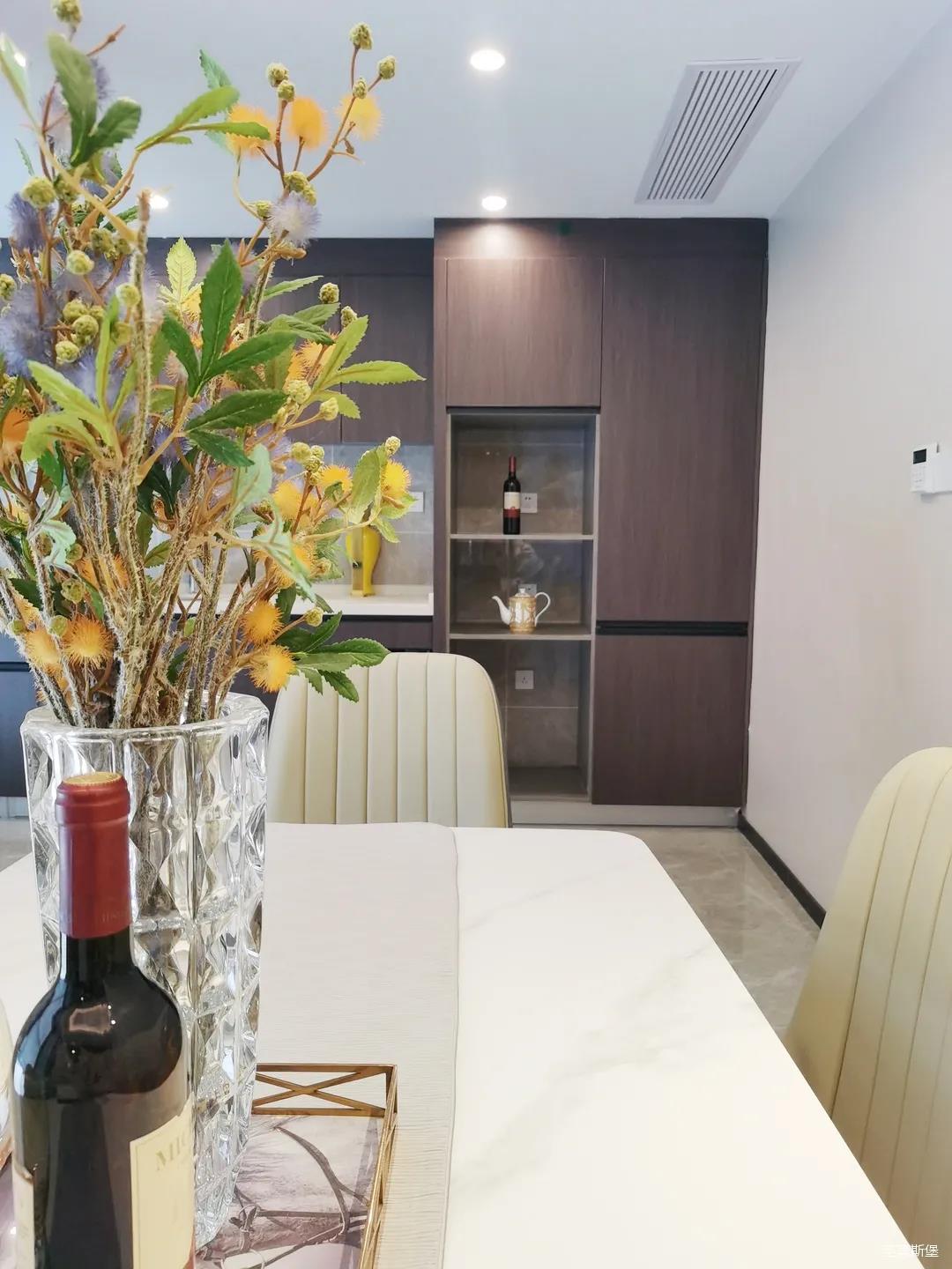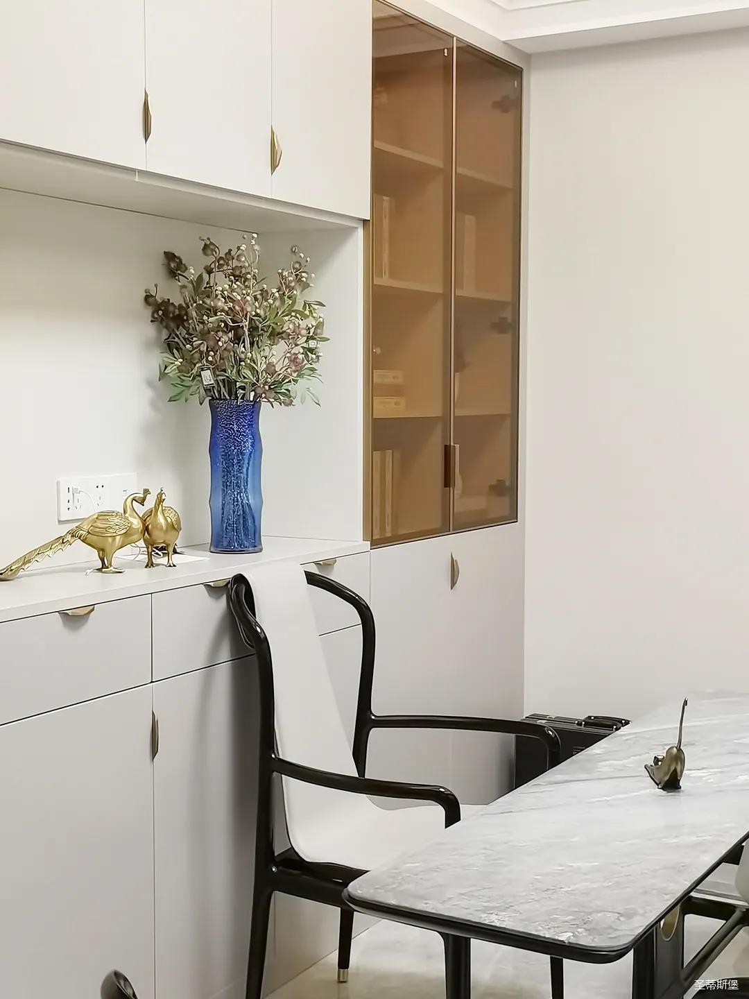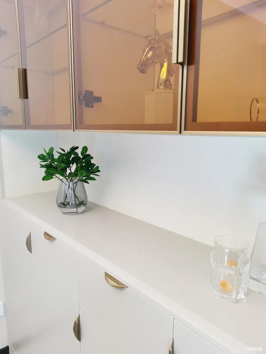 開放式的餐廚設(shè)計讓餐邊柜和櫥柜的居家動線更為流暢,成了最便利的收納場所,生活小資而又美好。
