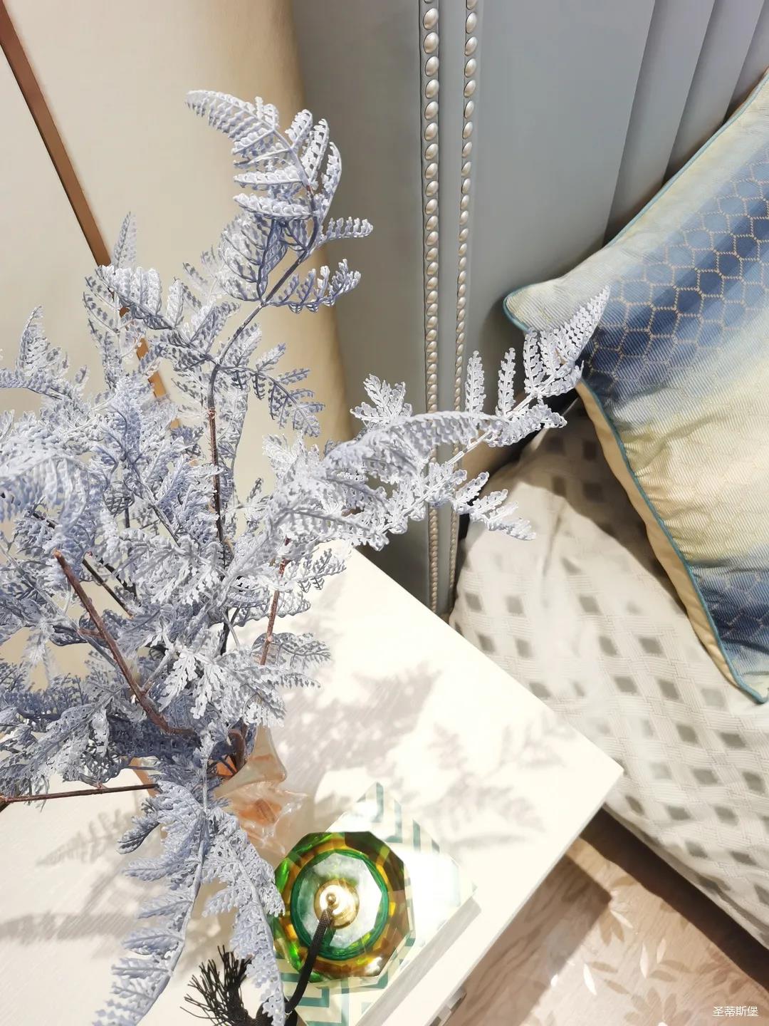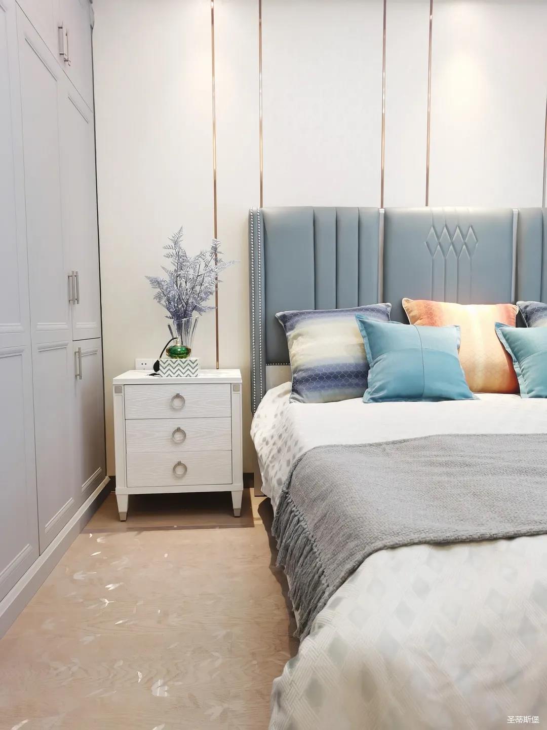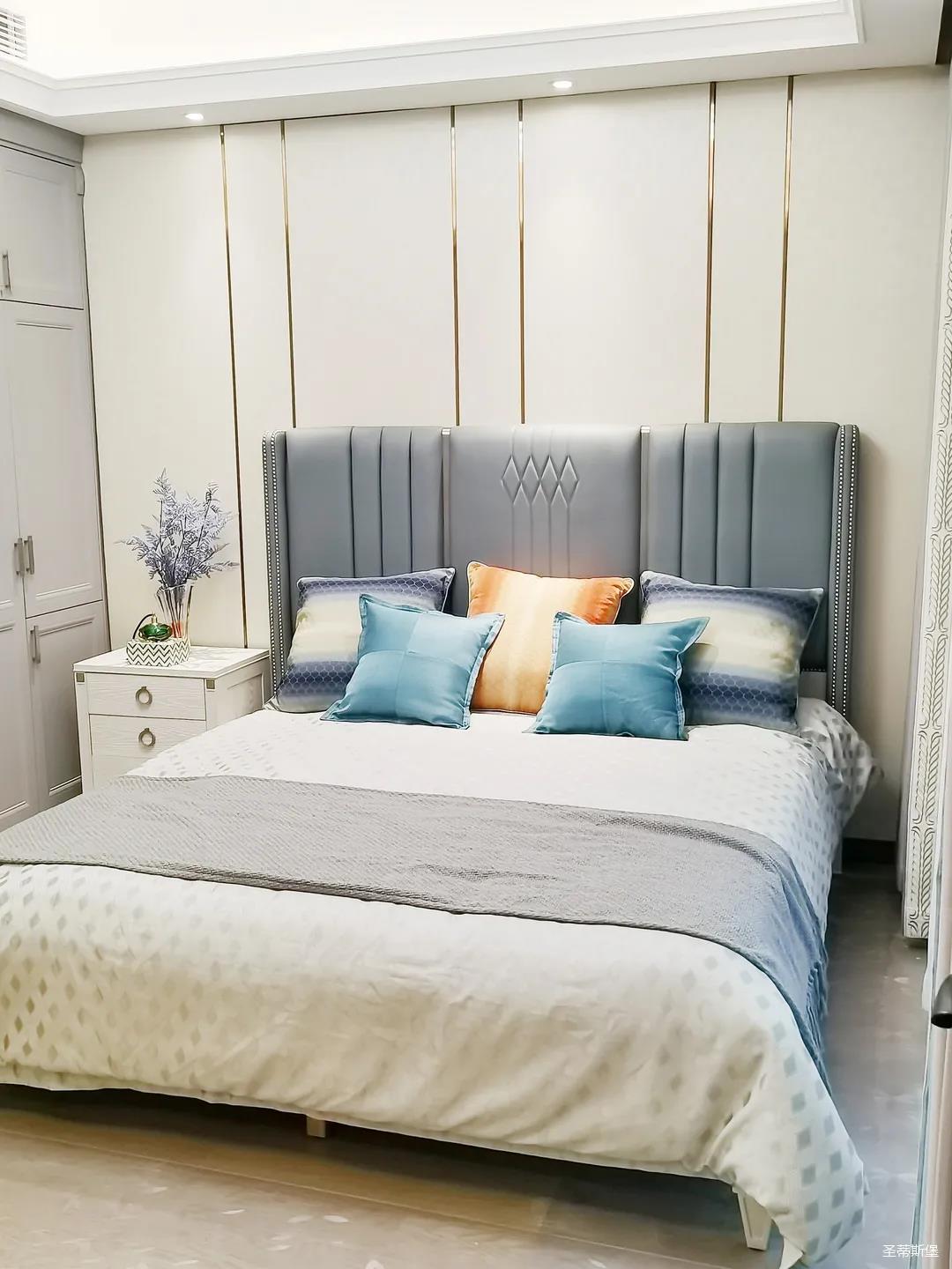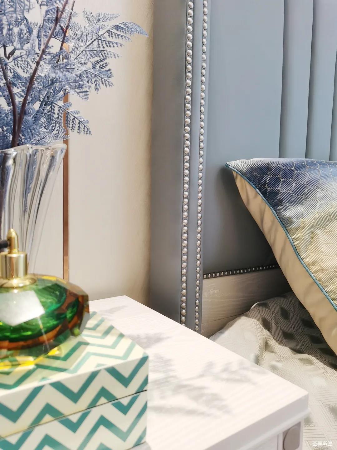 一樓的房間業(yè)主是作為長輩房,采用輕奢的背景墻面,結(jié)合亮眼的金屬線條設(shè)計,空間顯得時尚又不失沉穩(wěn)。莫蘭迪色的淺藍床屏,在無主燈設(shè)計與自然光線的碰撞下醞釀出不同的光影美感。