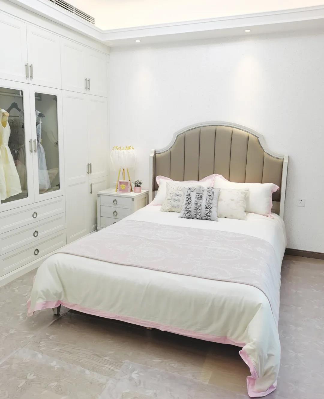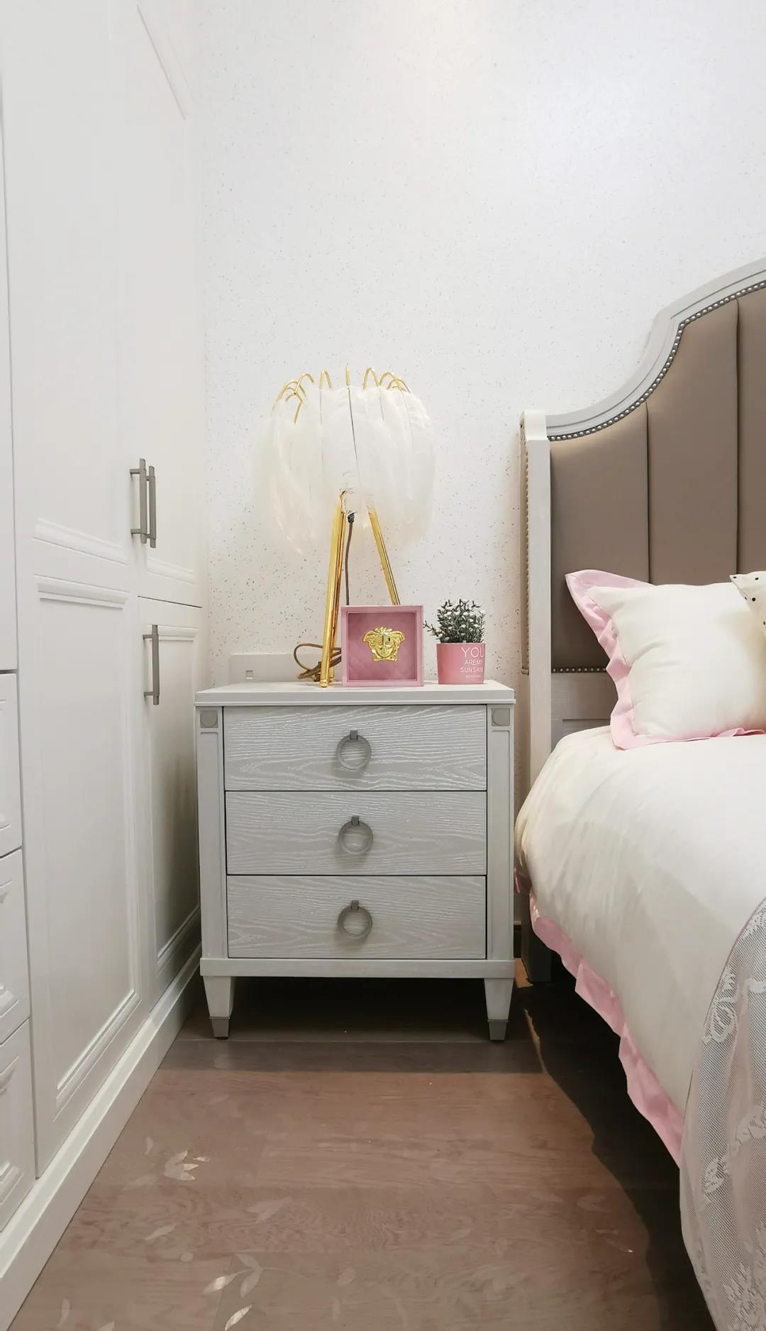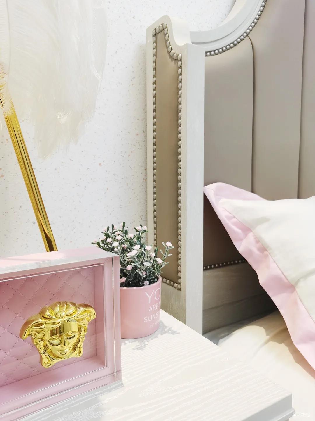 少女粉軟包床屏搭配仙氣十足的羽翼臺燈,讓空間顯得尤為夢幻。功能與顏值兼具的定制衣柜,與溫柔的空間相得益彰,簡單優(yōu)雅的同時也不失童趣。