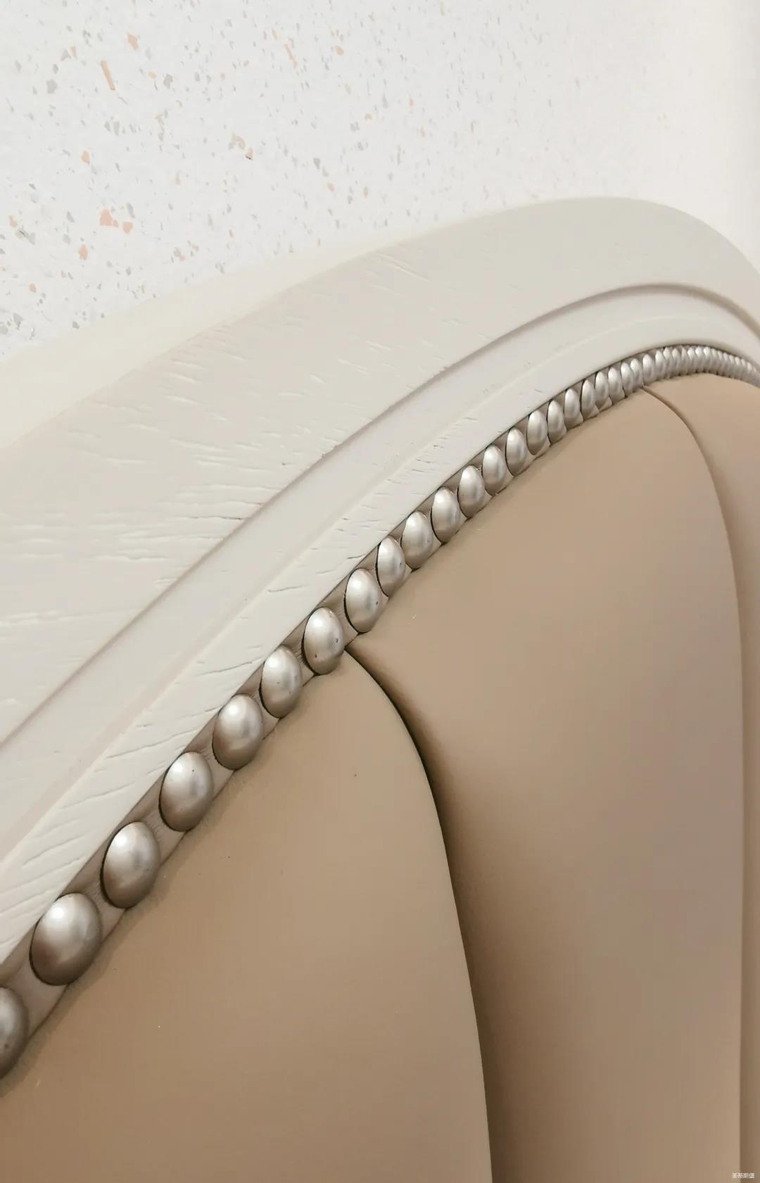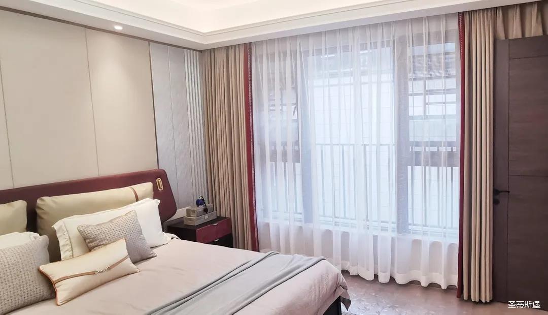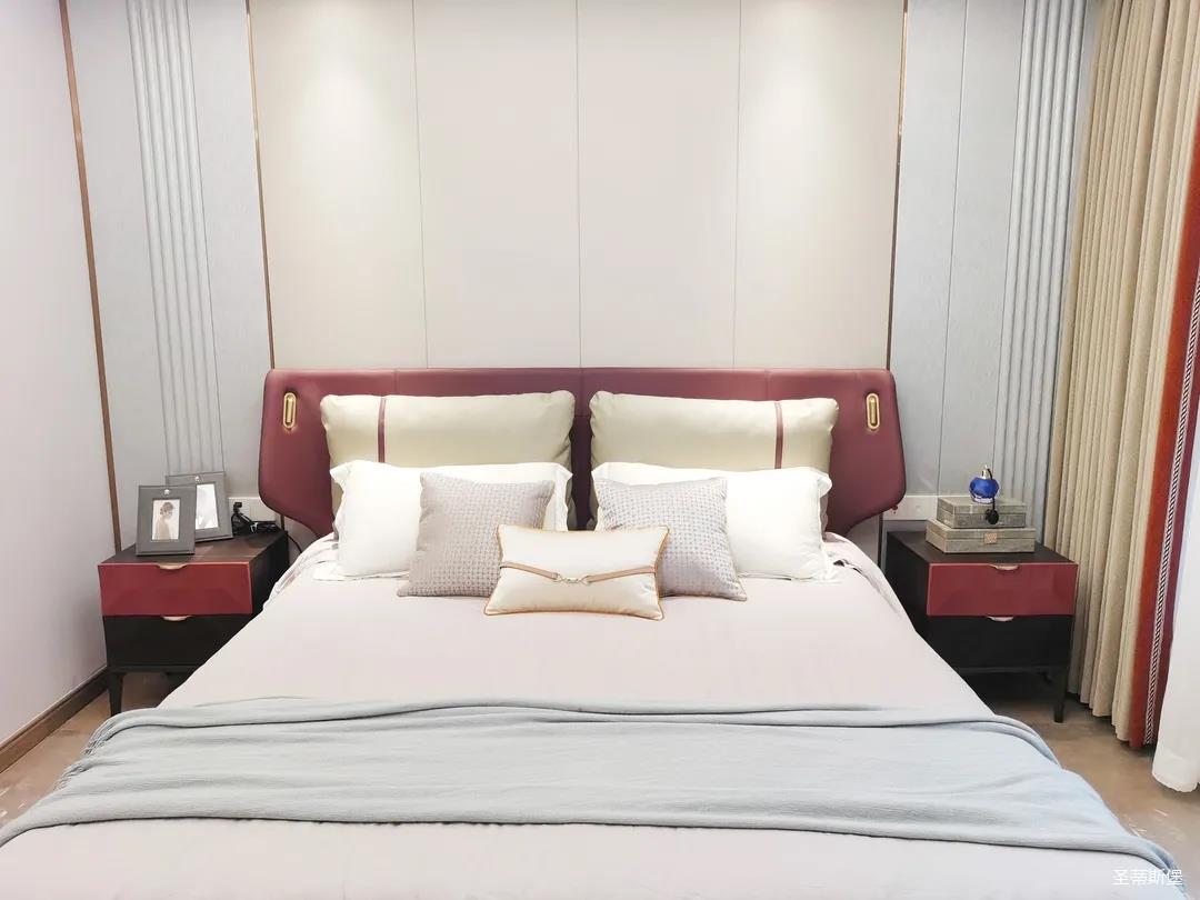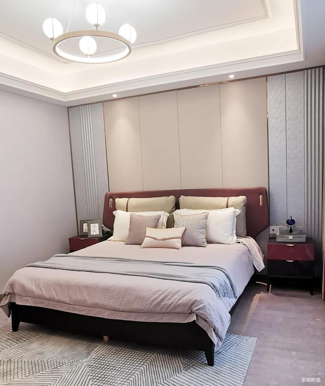 三樓的主人房設(shè)計風格更偏向簡約,浪漫的酒紅色床屏運用了曲面造型,融合了極簡主義美學(xué)和輕奢元素,小型夜間感應(yīng)燈設(shè)計讓每一處細節(jié)都充滿著時尚優(yōu)雅的氣息。夜間倚靠在厚實的軟包上,時光好像在不知不覺中慢了下來,讓我們能品味和咀嚼生活的氛圍。