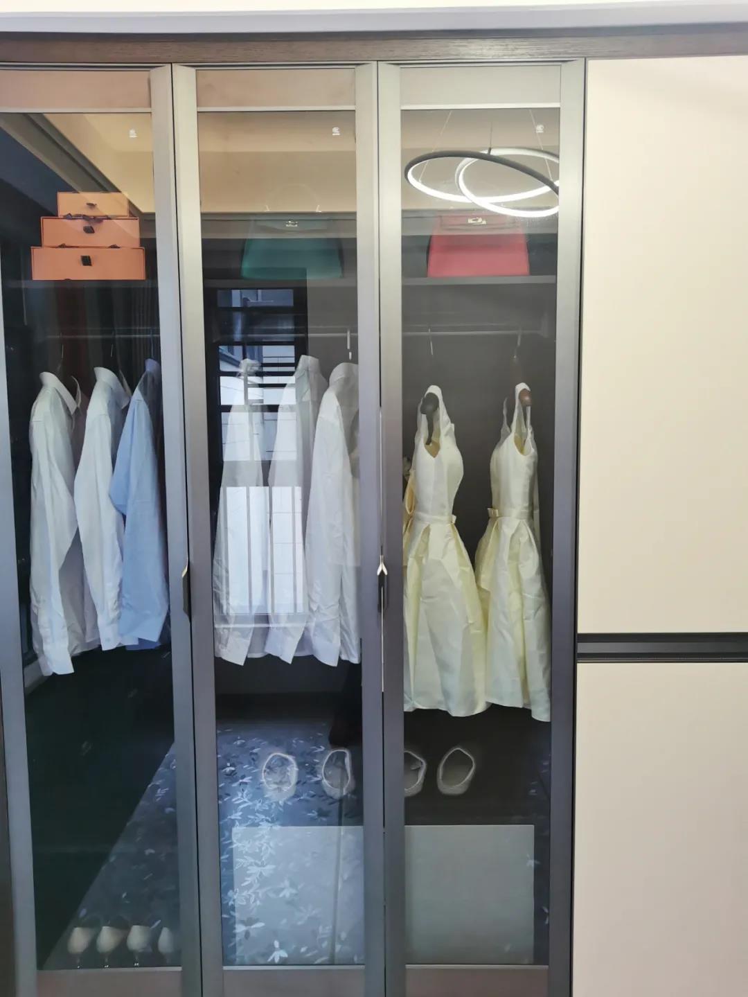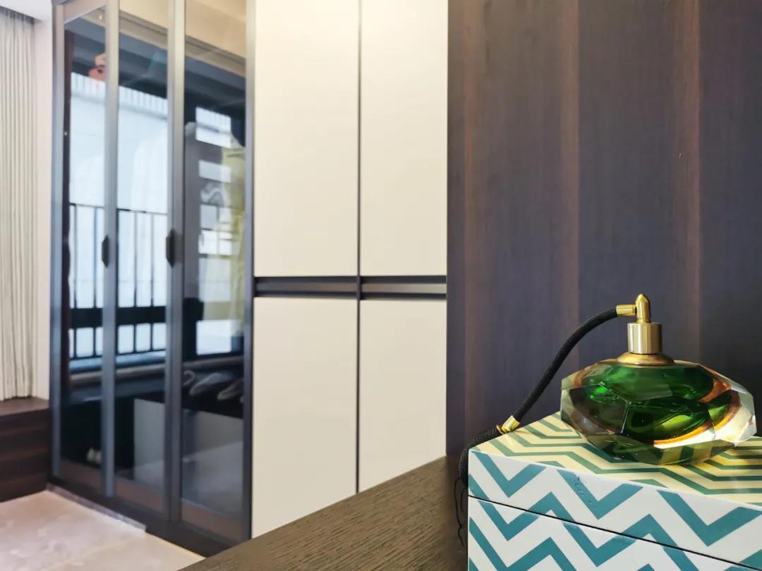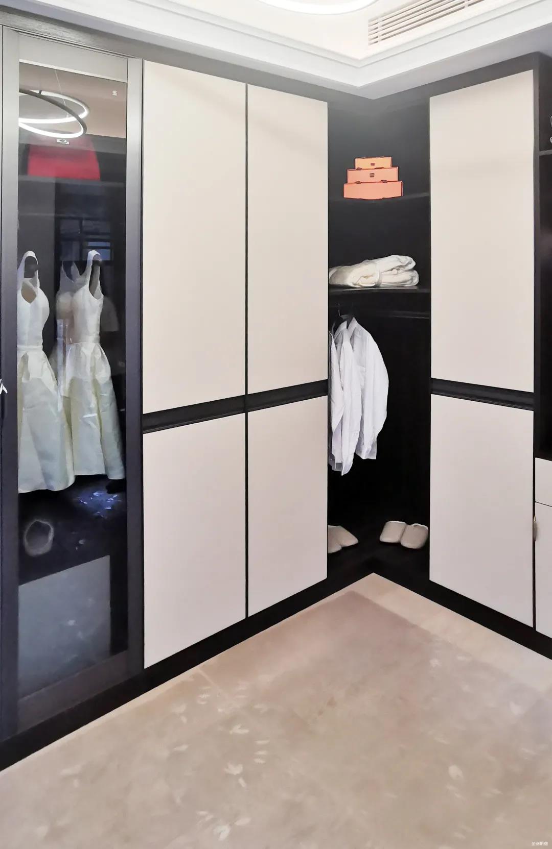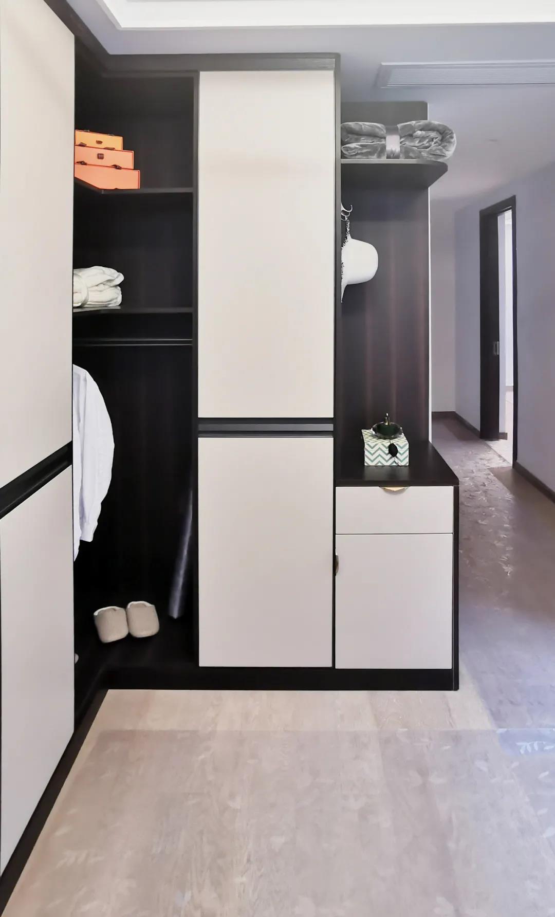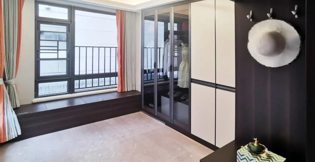 衣帽間以現(xiàn)代極簡設(shè)計手法引入輕奢元素,借助實木與金屬組合打破了傳統(tǒng)儲物區(qū)的沉悶感,煙熏色橡木紋的定制柜體,色澤好似一杯溫暖醇香的摩卡,令空間層次感與立體感的格調(diào)頓生,予以沉穩(wěn)舒適感官體驗。
