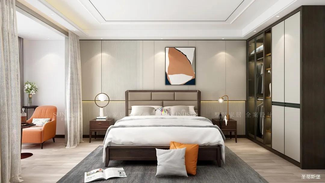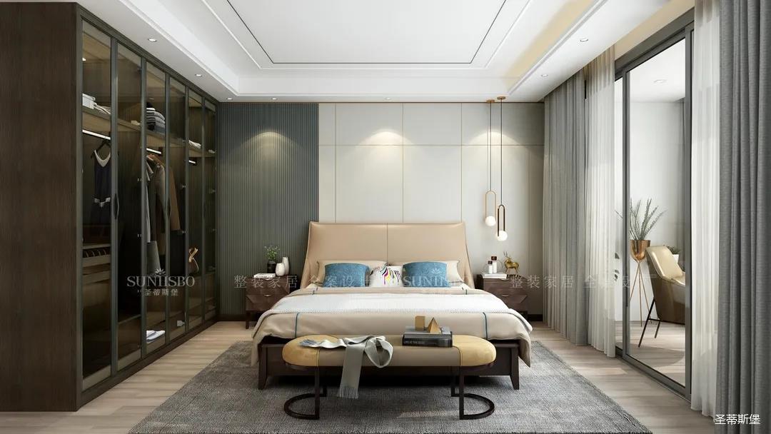 主臥運(yùn)用了大面積落地窗圍合,整體的無(wú)主燈設(shè)計(jì),凸顯了空間極簡(jiǎn)潮流。無(wú)限引入窗外的移動(dòng)光線(xiàn),輕松為空間注入陽(yáng)光的溫度,u型極簡(jiǎn)金屬懸置著一個(gè)白色造型燈,讓空間從靜謐中生出無(wú)窮的變幻。家具設(shè)計(jì)偏向簡(jiǎn)約舒適,造型雖不奪目,但細(xì)節(jié)質(zhì)感卻能經(jīng)得起時(shí)光的琢磨與品味。
