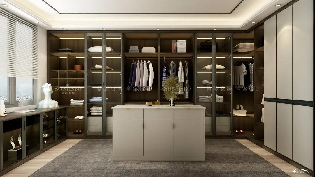 衣帽間采用了虛實(shí)結(jié)合的設(shè)計(jì),構(gòu)筑起規(guī)整而有序的置物區(qū)域和功能齊全的收納系統(tǒng),煙熏色實(shí)木作為空間的主要元素,環(huán)抱著整個(gè)衣帽間,張揚(yáng)又不失沉穩(wěn),恰到好處地搭配金屬玻璃置頂高門(mén)和感應(yīng)燈光系統(tǒng),挑高了空間效果,也詮釋著現(xiàn)代極簡(jiǎn)線(xiàn)條美感和對(duì)極致的生活追求。