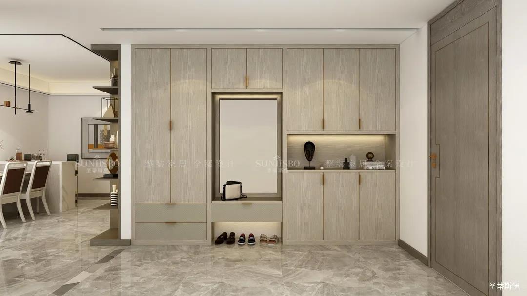 玄關(guān)柜采用內(nèi)嵌式設(shè)計,柜體合理分區(qū),可涵蓋大量入戶閑置物品。