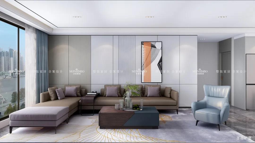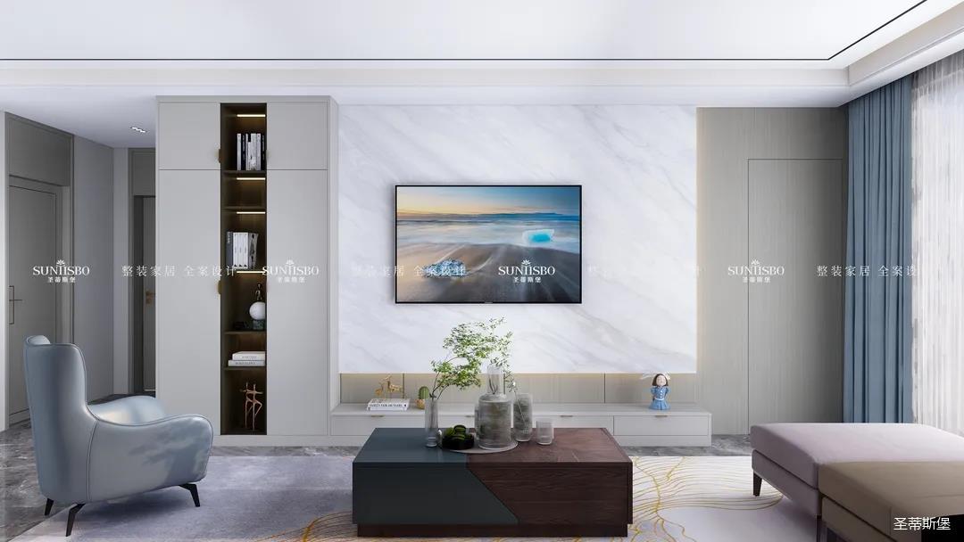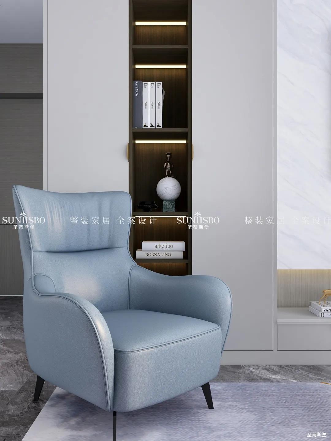 優(yōu)雅淺灰L型定制柜與紋理清晰的大理石組合電視墻,滿足了業(yè)主審美與實用的雙向需求。一張淡藍色的休閑椅,讓業(yè)主能感受到亮麗明艷色彩之外的獨特,低調(diào)不張揚,卻在溫潤中傳遞出色彩的力量。通過紋理清晰的護墻為底,為柔和優(yōu)雅的靜態(tài)客廳增添了層次感十足的空間律動。