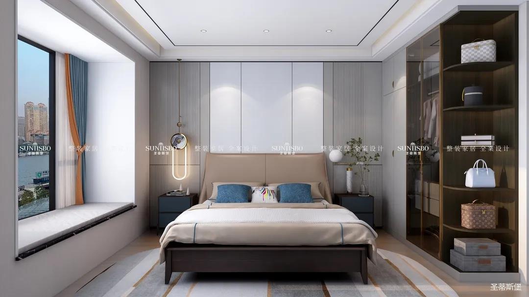 臥室把自然光線納入空間。穩(wěn)重的淺咖色床屏搭配柔和的灰白護墻,渲染了空間去繁從簡的設計。品質(zhì)精致的床品面料觸感自然柔軟,真皮質(zhì)地的家具匹配空間氣質(zhì),為業(yè)主營造了舒適愜意的休憩空間。