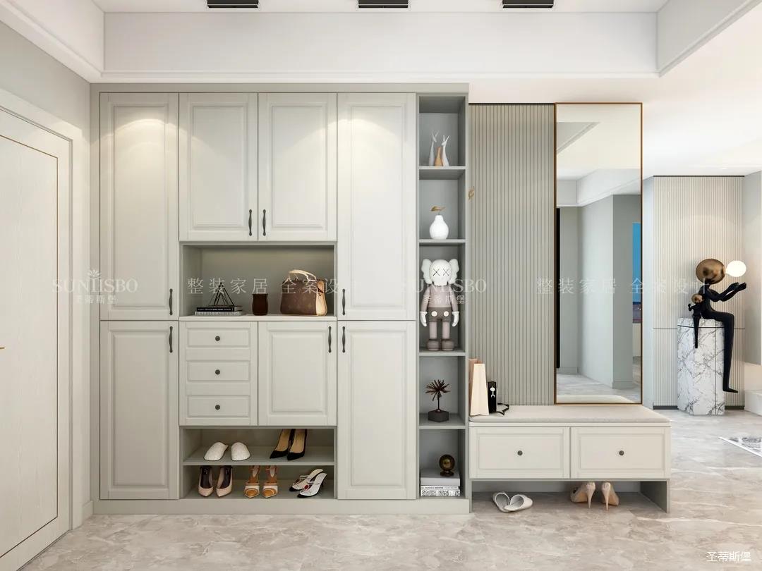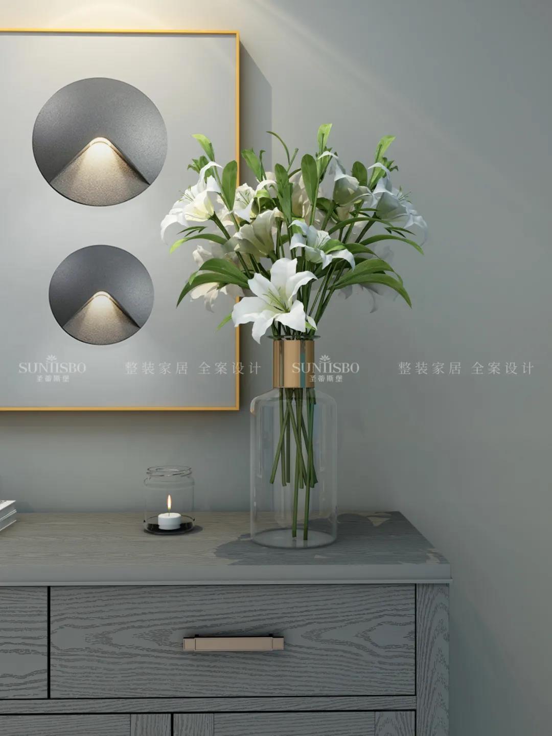 入戶側(cè)面設(shè)計(jì)一字型玄關(guān),腰部,底部留空做層板,便于隨手放置鑰匙、鞋包等物品,中間留空設(shè)計(jì)為開放展示區(qū),加上軟裝飾品點(diǎn)綴,達(dá)到業(yè)主對(duì)品質(zhì)生活追求的理想狀態(tài)。應(yīng)女主人要求,玄關(guān)還加長延伸出妝鏡和換鞋凳,讓動(dòng)線自然流暢。