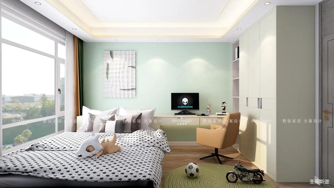 兒童房是清新的淺綠格調(diào),時(shí)尚個(gè)性又不失溫馨舒適。衣柜與墻體深淺色完美匹配整體硬裝,協(xié)調(diào)統(tǒng)一。黑白圓點(diǎn)棉質(zhì)床品與壁畫(huà)形成同色系搭配,充盈了空間的飽滿(mǎn)度。