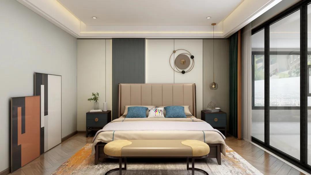 次臥淺灰色的背景墻時尚又內(nèi)斂,入目盡顯舒適的視覺感,為了避免過于單調(diào),特意搭配了與整體保持一致的拼色窗簾,作為空間色彩的點綴。